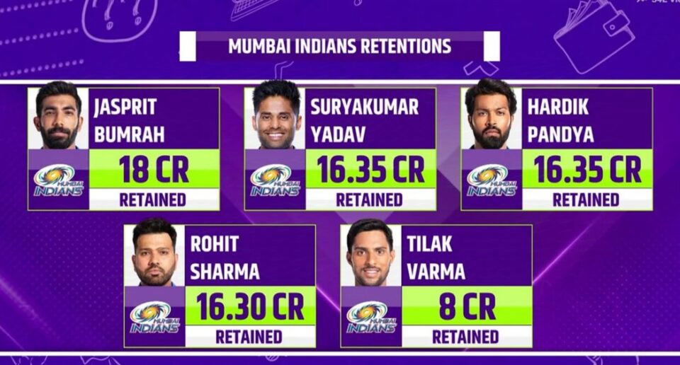 मुंबई इंडियंस ने 5 खिलाड़ियों को रिटेन किया है, जिनमें जसप्रीत बुमराह (18 करोड़ रुपये), सूर्यकुमार यादव (16.35 करोड़ रुपये), हार्दिक पांड्या (16.35 करोड़ रुपये), रोहित शर्मा (16.30 करोड़ रुपये), तिलक वर्मा (8 करोड़ रुपये) के नाम शामिल हैं।