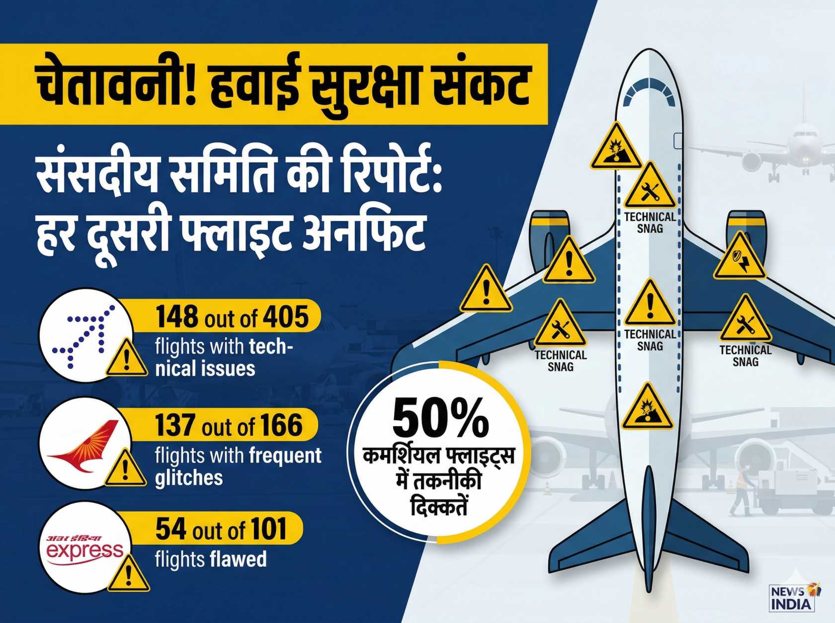 गईं, जबकि एयर इंडिया एक्सप्रेस की 101 में से 54 उड़ानें सुरक्षा मानकों पर खरी नहीं उतरीं। यह आंकड़ा बताता है कि एयर इंडिया की तो लगभग 80 प्रतिशत से अधिक उड़ानें किसी न किसी तकनीकी खराबी के साये में आसमान नाप रही हैं।