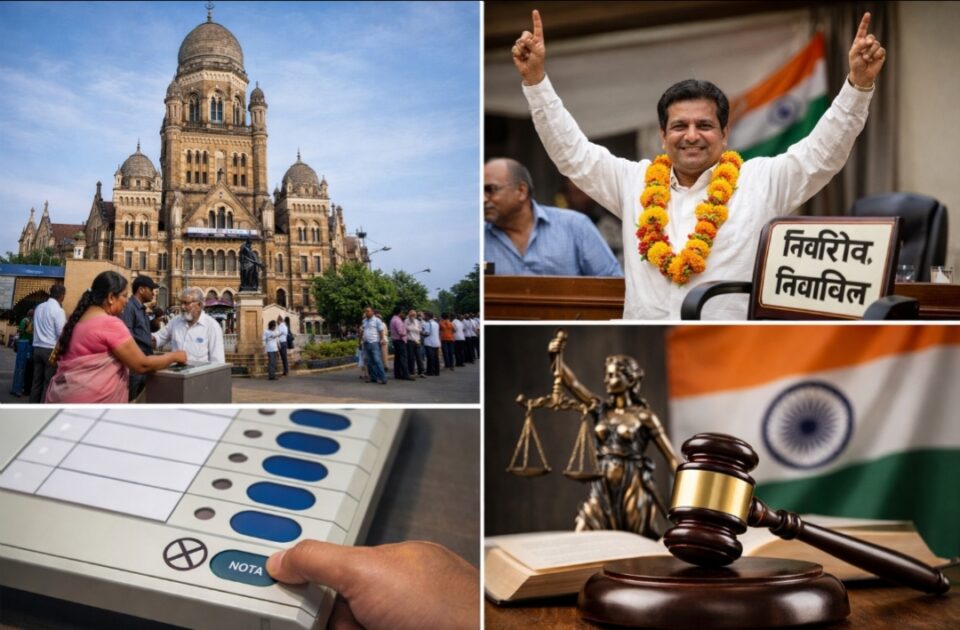 ✍🏻 डिजिटल न्यूज़ डेस्क, मुंबई | महाराष्ट्र में बीएमसी समेत कई महानगरपालिकाओं और स्थानीय निकायों में लगातार बढ़ती बिनविरोध निर्वाचनों की संख्या ने चुनावी व्यवस्था को लेकर नई बहस छेड़ दी है। नागरिकों के बीच सबसे बड़ा सवाल यही है कि अगर मतदान ही नहीं होता, तो मतदाता का NOTA का अधिकार आखिर कहां चला जाता है? इसका उत्तर भावनात्मक नहीं, बल्कि कानून की स्पष्ट और बाध्यकारी व्यवस्था में निहित है।