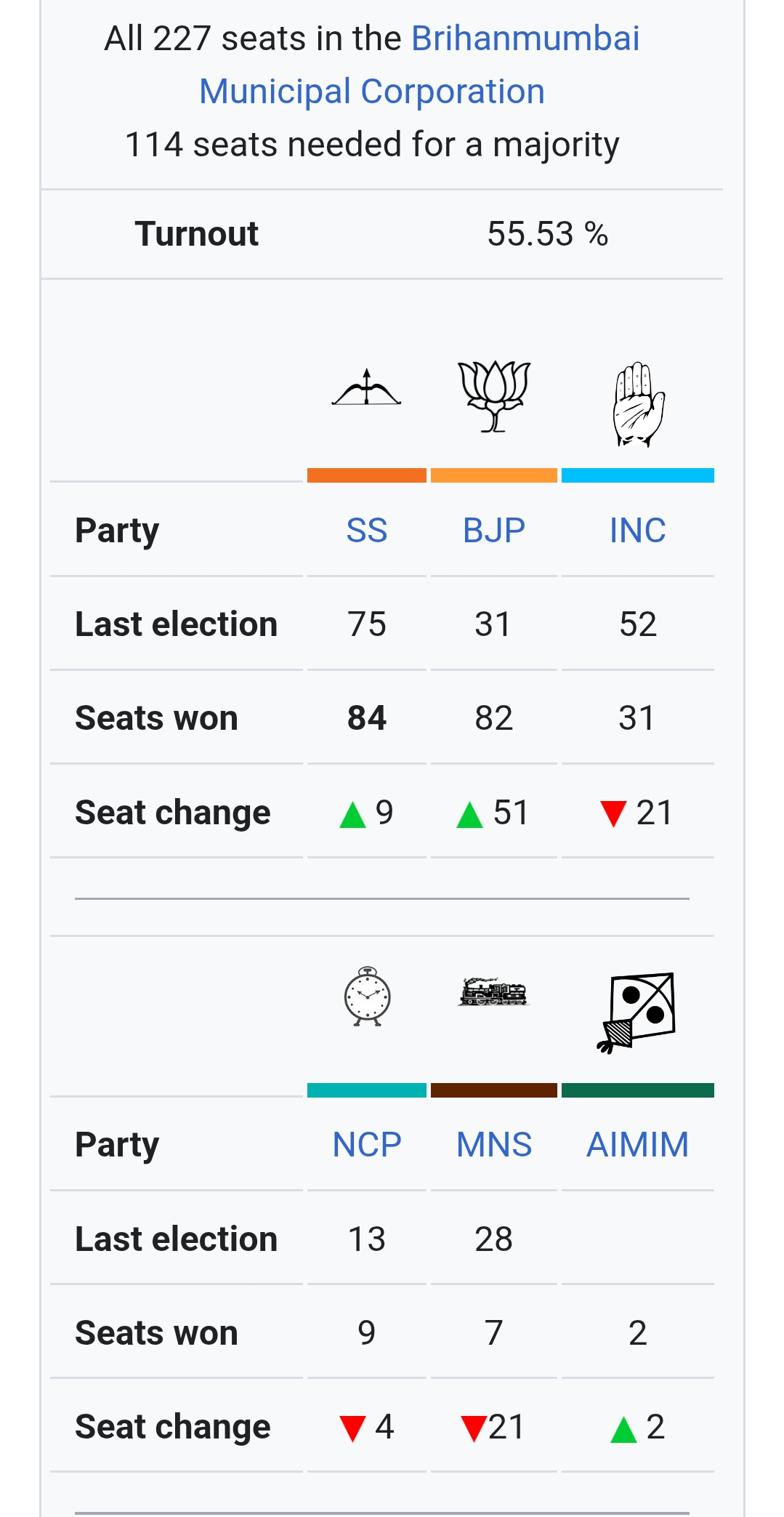 साल 2017 के चुनाव परिणाम आज भी प्रासंगिक हैं। 227 सीटों वाली बीएमसी में बहुमत के लिए 114 सीटों की दरकार थी। उस समय 55.53% वोटिंग हुई थी और अविभाजित शिवसेना (SS) ने 84 सीटें जीतकर अपना दबदबा कायम रखा था, लेकिन सबसे चौंकाने वाला प्रदर्शन भाजपा का था। 2012 में महज 31 सीटों पर सिमटी भाजपा ने 2017 में 51 सीटों की भारी बढ़त के साथ 82 सीटें हासिल की थीं।