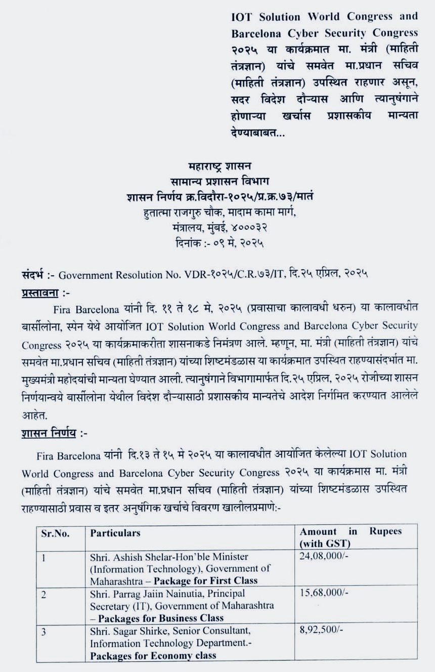 इनमें केवल हवाई यात्रा का खर्च ही 11.5 लाख रुपए है। मंत्री शेलार को फर्स्ट क्लास (₹8.71 लाख), पराग जैन को बिजनेस क्लास (₹2.02 लाख), और शिरके को इकोनॉमी क्लास (₹79,000) से यात्रा की स्वीकृति दी गई है।