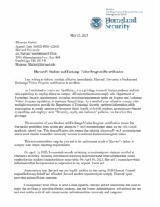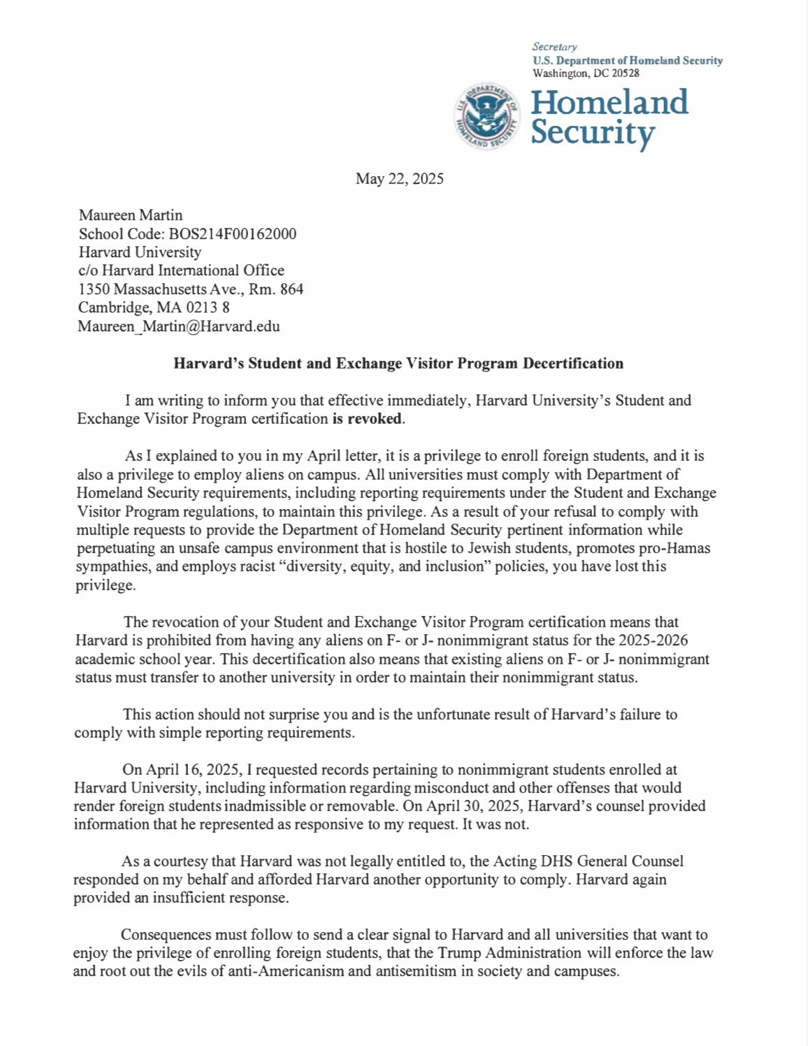 होमलैंड सुरक्षा सचिव क्रिस्टी नोएम ने एक पत्र में कहा कि होमलैंड सुरक्षा विभाग ने यह नवीनतम कदम इसलिए उठाया क्योंकि हार्वर्ड विश्वविद्यालय ने अपने विदेशी छात्रों के बारे में रिकॉर्ड प्रस्तुत करने के अनुरोधों का पालन करने से इनकार कर दिया था।