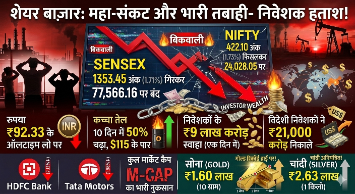 ✍️ डिजिटल न्यूज डेस्क, मुंबई | मिडिल ईस्ट में गहराते भू-राजनीतिक तनाव और ईरान-इजराइल के बीच युद्ध की स्थितियों ने सोमवार को भारतीय शेयर बाजार में कोहराम मचा दिया। सप्ताह के पहले ही कारोबारी दिन निवेशकों के मन में व्याप्त डर बिकवाली में बदल गया, जिससे बॉम्बे स्टॉक एक्सचेंज का सूचकांक सेंसेक्स 1353 अंक (1.71%) की भारी गिरावट के साथ 77,566 के स्तर पर बंद हुआ। वहीं, निफ्टी भी 422 अंक फिसलकर 24,028 पर आ गया।