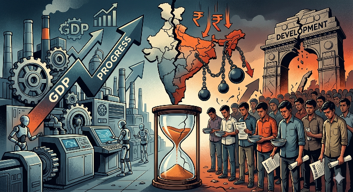 गीता गोपीनाथ ने भारत की विकास गाथा को ‘रोजगार-विहीन’ कहकर आईना दिखा दिया है। यहां तरक्की का शोर तो है, लेकिन युवाओं के हाथ खाली हैं। जमीन, जेहन और न्याय के बुनियादी सुधारों की जगह सरकार ने सिर्फ आंकड़ों का भ्रम पाला है, जिसमें ‘विकसित भारत’ का सपना हकीकत की जमीन पर दम तोड़ रहा है।